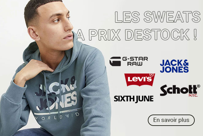 Jack & Jones, G-Star, Schott, Sixth June… Les logos qui comptent, les coupes tendance, le confort absolu : tout y est. Et comme toujours chez nous, c’est au prix déstockage, jusqu’à –50% toute l’année.