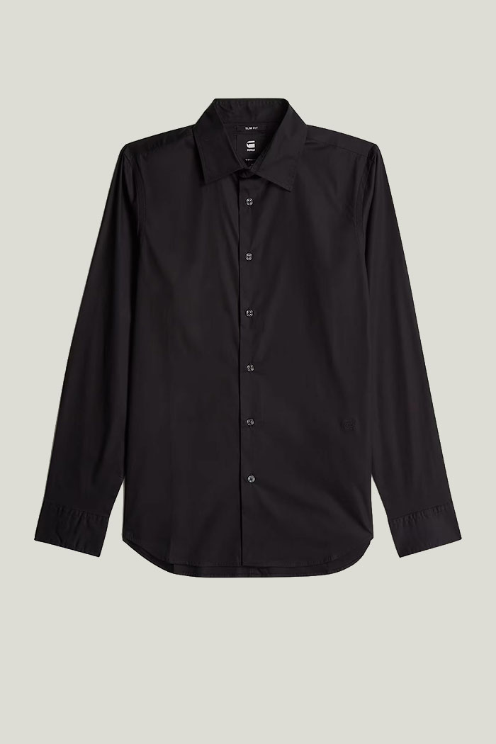Sous le blouson, la chemise G-Star noire slim apporte une touche plus structurée à la tenue. Réalisée en coton et élasthanne, elle offre une belle liberté de mouvement tout en soulignant la silhouette. Son col chemise classique et ses poignets ajustables par boutons en font une pièce polyvalente, facile à porter aussi bien fermée pour un style soigné qu’entrouverte pour une allure plus décontractée.