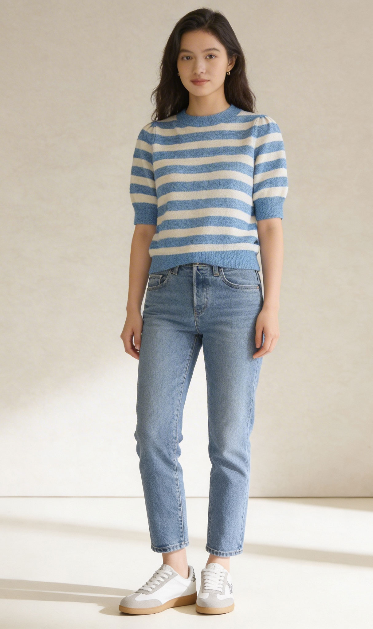 Fraîche, moderne et facile à porter, cette silhouette féminine joue la carte du bleu intemporel associé à des basiques revisités. Une tenue pensée pour le quotidien, qui conjugue confort, féminité et esprit urbain.