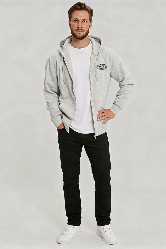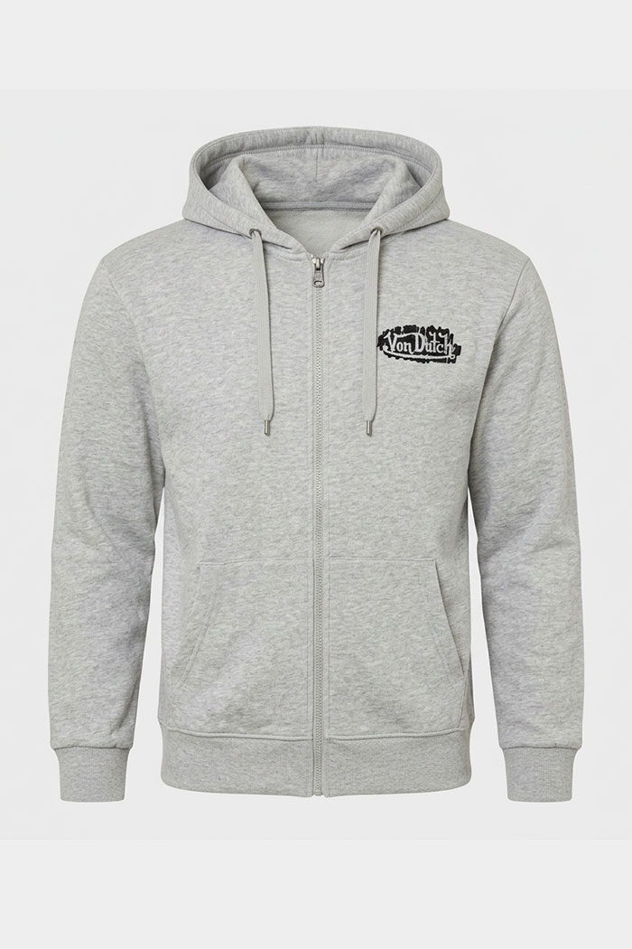 Le sweat zippé à capuche gris clair signé Von Dutch s’impose comme l’élément clé de la tenue. Sa coupe confortable et sa capuche en font un allié idéal pour les variations de température.