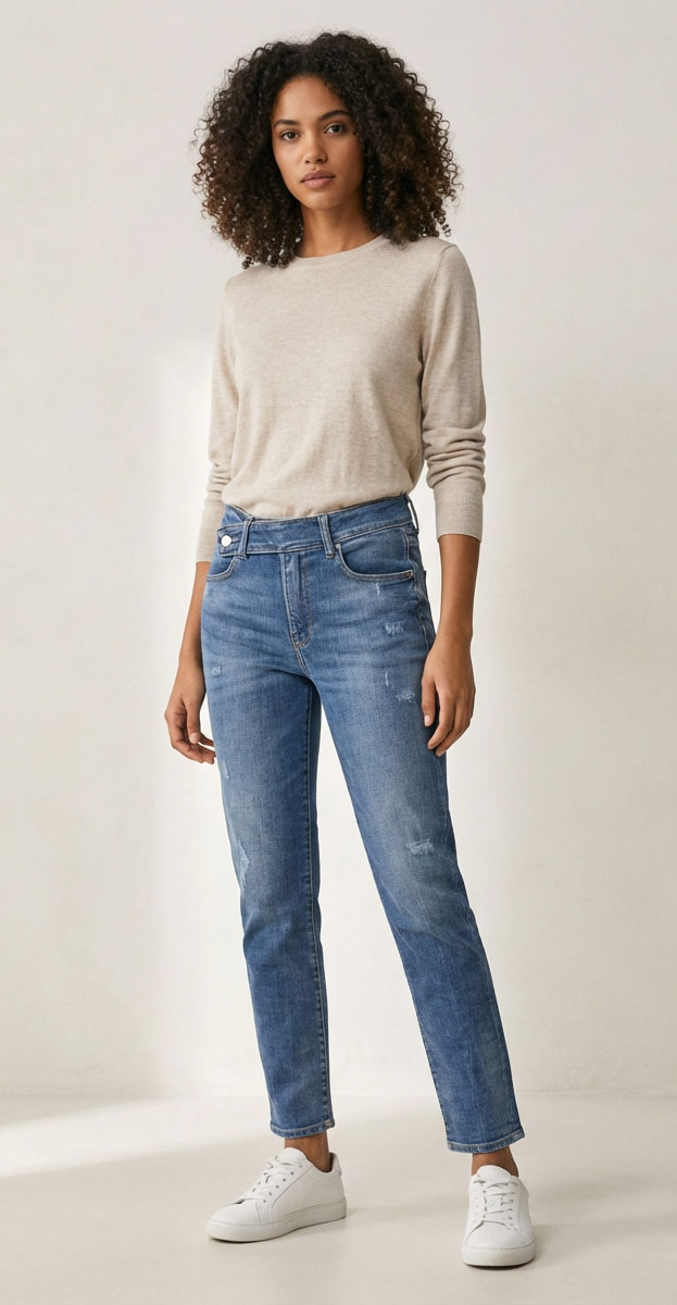 Avec sa taille haute, ce modèle met en valeur la ligne de taille et allonge visuellement les jambes. Sa coupe droite assure un tombé net et équilibré, facile à associer aussi bien avec un pull oversize qu’une blouse plus ajustée.