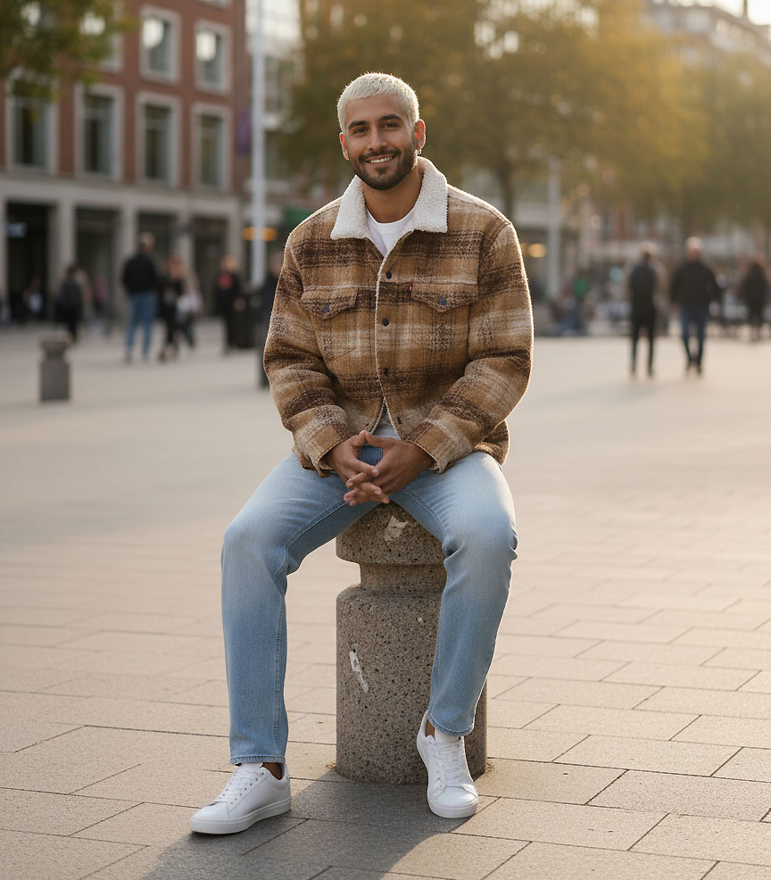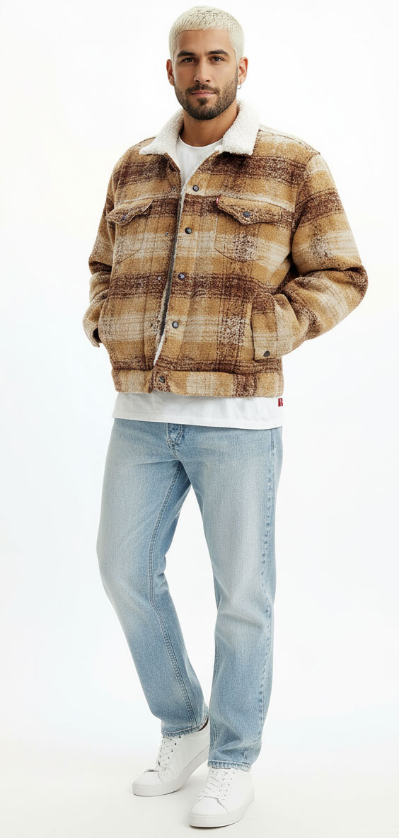 La pièce phare, c’est bien sûr la veste trucker Levi’s à carreaux façon plaid. Avec son intérieur doublé sherpa ultra-doux, elle incarne à la perfection l’esprit outdoor revisité par Levi’s : un mélange de chaleur, de caractère et d’élégance décontractée. À la fois rustique et urbaine, cette veste se porte aussi bien sur un t-shirt que sur une maille, pour affronter les journées fraîches avec style.