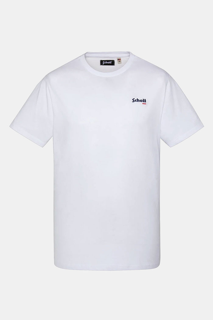 Sous la chemise, le t-shirt blanc Schott joue la carte de la sobriété efficace. Simple mais toujours iconique, il apporte luminosité et contraste à l’ensemble. Conçu en coton doux, il assure un confort optimal tout en mettant en avant le logo discret, marque de l’esprit authentique et intemporel de Schott. C’est la pièce essentielle qui équilibre et modernise la silhouette.