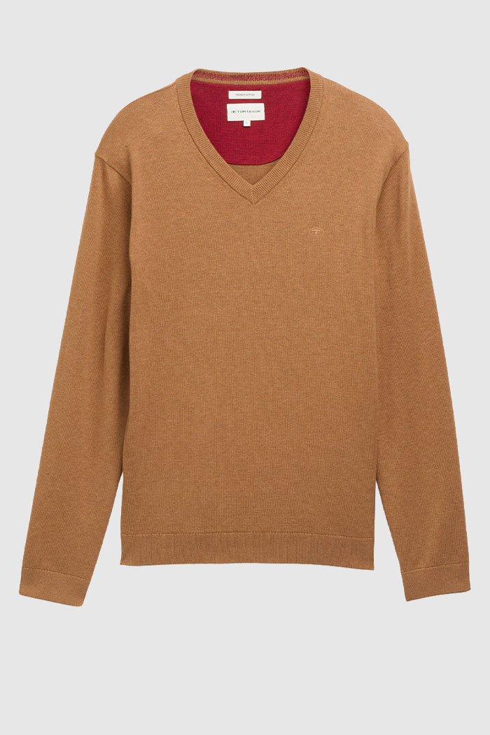 Pièce centrale de ce look, le pull Tom Tailor marron à col V apporte une touche de chaleur visuelle et d’élégance décontractée. Sa teinte marron, tendance et facile à associer, s’inscrit parfaitement dans l’esprit de la saison. Le col V laisse apparaître un t-shirt bordeaux pour un rendu soigné, tout en restant confortable et agréable à porter au quotidien.