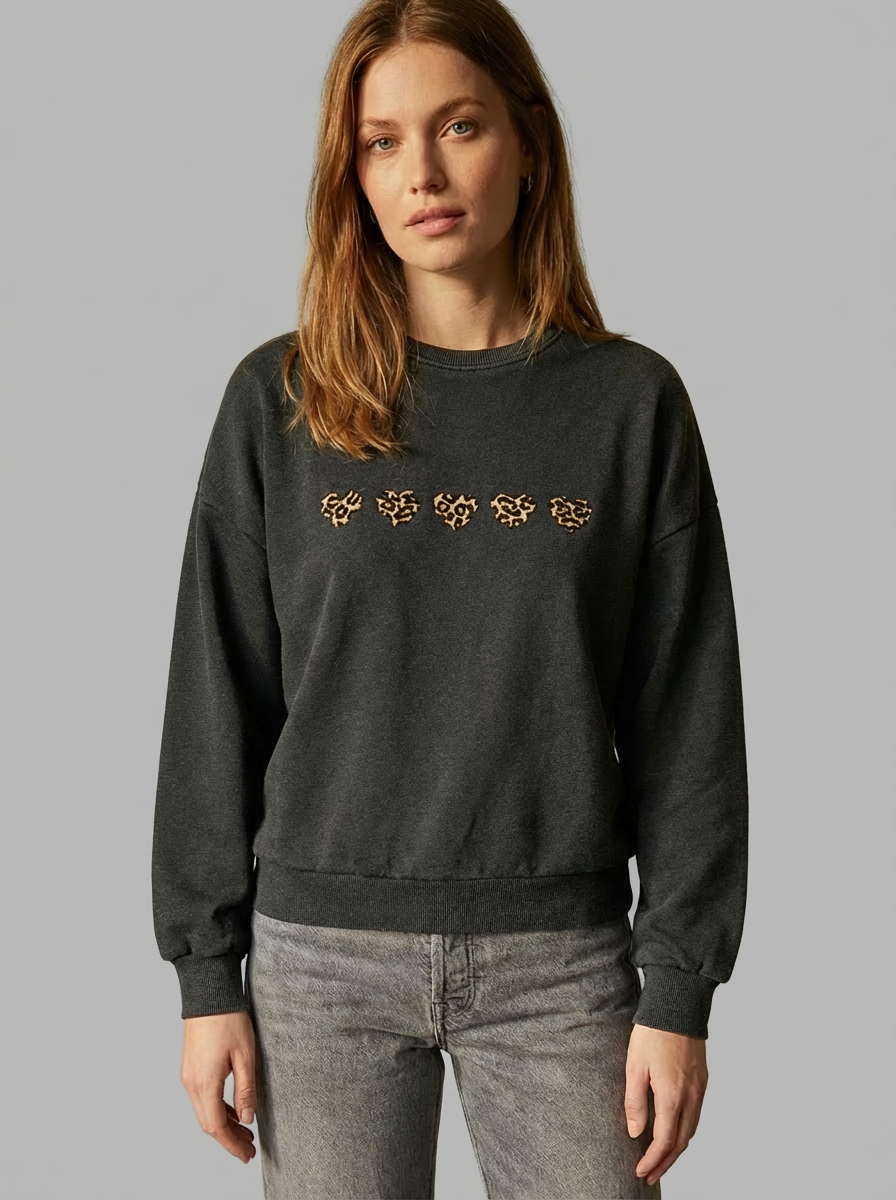 Ce sweat séduit d’abord par son coloris gris-noir, facile à associer et résolument moderne. Sa coupe confort assure un porté agréable au quotidien, tout en offrant une silhouette décontractée et féminine. Mais ce qui fait toute la différence, ce sont ses petits cœurs fantaisie imprimés léopard : un détail subtil et tendance qui apporte une touche de caractère et d’originalité à cette pièce incontournable du dressing.