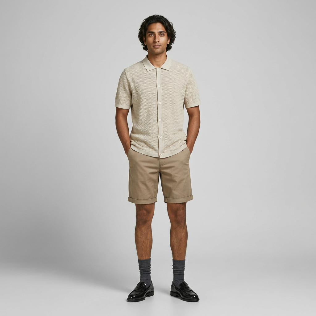 Pour compléter la silhouette, le short chino beige foncé vient structurer l’ensemble avec modernité. Sa coupe regular assure un tombé impeccable, tandis que sa composition en coton bio et élasthanne garantit confort et liberté de mouvement. Doté d’une braguette zippée et de 5 poches, il allie praticité et style pour accompagner toutes vos sorties estivales.