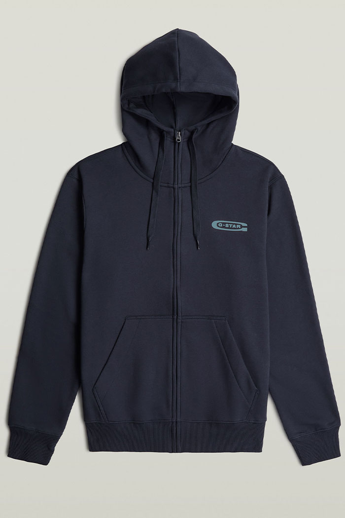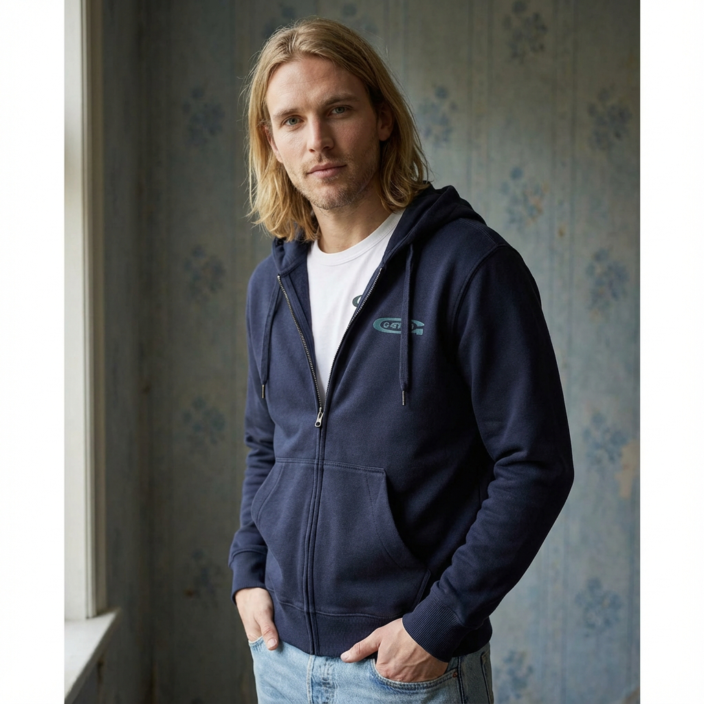 Au cœur de ce look, on retrouve un sweat zippé à capuche G-Star coloris bleu marine, une pièce essentielle du vestiaire masculin. Sa coupe droite assure une allure nette et polyvalente, tandis que sa composition en 55% coton et 45% polyester recyclé garantit un confort optimal au quotidien. Le tissu stretch offre une liberté de mouvement appréciable, idéale pour une journée active. Les détails soignés, comme la capuche avec cordon de serrage et le logo G-Star discret sur la poitrine côté cœur, renforcent son style urbain et contemporain.